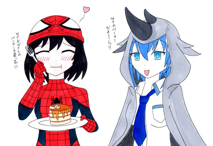 @takahi_RO 「荒野のコトブキ飛行隊」のキリエにスパイダーマンのコスを着せました!ライノにはサイのパーカーです。アニメ第2期が制作されて生きてることになってほしいです!あとコミックとアニメの展開が違いますように…‼