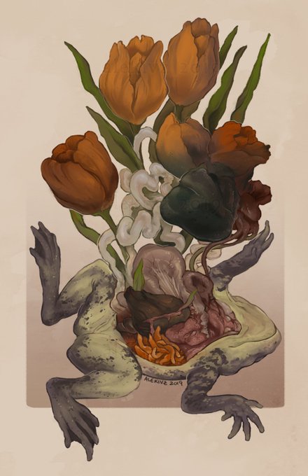 it's #PortfolioDay again! i'm kingsley, i draw a lot of things based on animals, guts, botanicals, and all of the above. i also design merch!