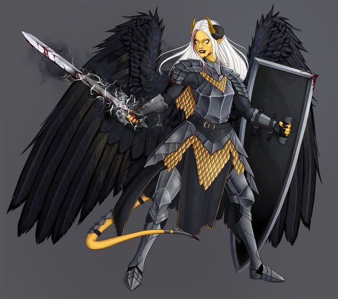 My current pf character, Hemlock (they/them), a black blade magus tiefling!