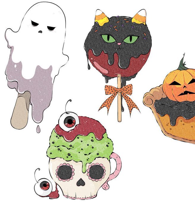 More Halloween treats. Ghost pop, Candy apple cat and skull ice cream. 🍦🍎💀👻