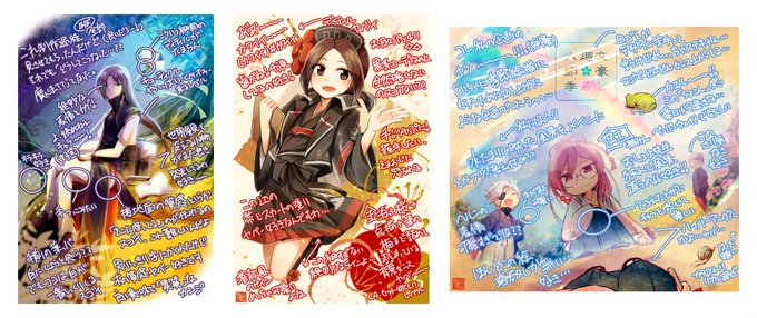 ちなみに元絵はこんな感じ、時期外れになっちゃったけどビニール素材はどうしても夏っぽいデザインにしたくて水着(?)三剣士捏造。11巻の人物紹介ページが可愛すぎるんだよなあ…