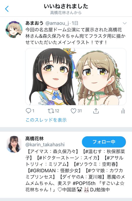 今回の名古屋ドーム公演にて展示された高橋花林さん&森久保乃々ちゃん宛てフラスタ用に描かせていただいたメインイラスト!です!