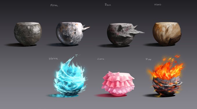 finally finished rendering all of these different materials (metal, rock, wood, water, cloth and fire). first time doing something like this but it's really good practice