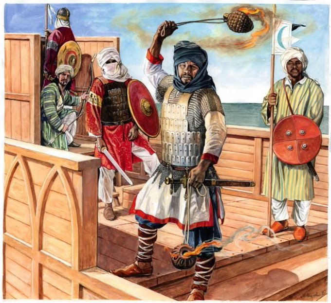 Does anyone know of medieval or modern illustrations of Islamic naffatun (naphtha) troops? they wielded fire weapons and wore padded asbestos uniforms
