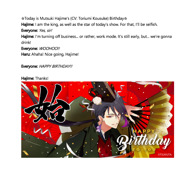 Mutsuki Hajime's birthday tweets from Tsukiuta. Twitter! (1/3)