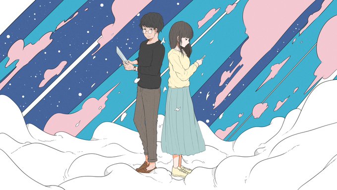 背景ほぼ青色一色のフラットな絵が好きでよく描きます。でも夏は暑くてベタベタしてきらいです( 'ཫ' )