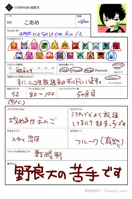 #コンパス履歴書 #コンパスお絵描き勢と繋がりたい 青丸は普通に使えて 三角は微妙 ❌は使ってもくそかいないキャラです。 いつでも暇してるので 誘ってもらえれば 枠埋めします。 まぁ主に忠臣とるちがすきです
