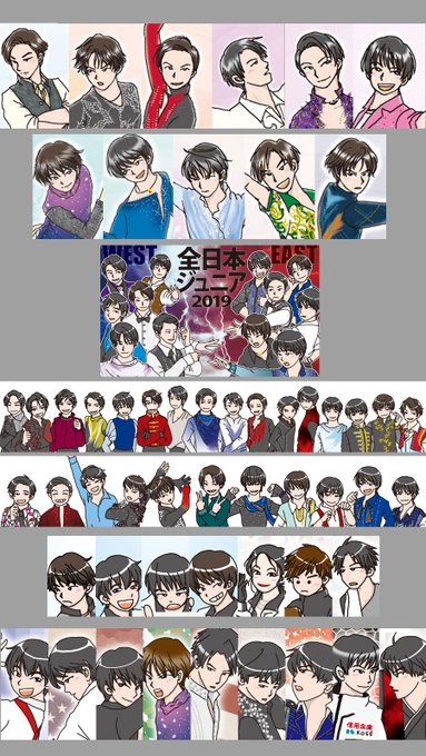 2019/2020シーズンで描いた選手たち38名(全日本+全中+明法)を並べました。素敵な演技を見せていただき、ありがとうございました。女子はりんちゃんだけでごめんね。だいたい年齢順になってると思う。来シーズンも楽しみにしています。