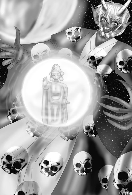 完成しました。前回描いた「仏法戦記アミーダ」のナオトとカノンの初コンタクトシーンをリメイク描き(カラーとモノクロ)しました。二枚目は、小説の挿絵として使います。