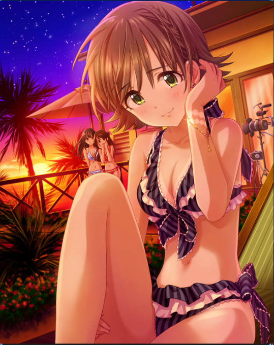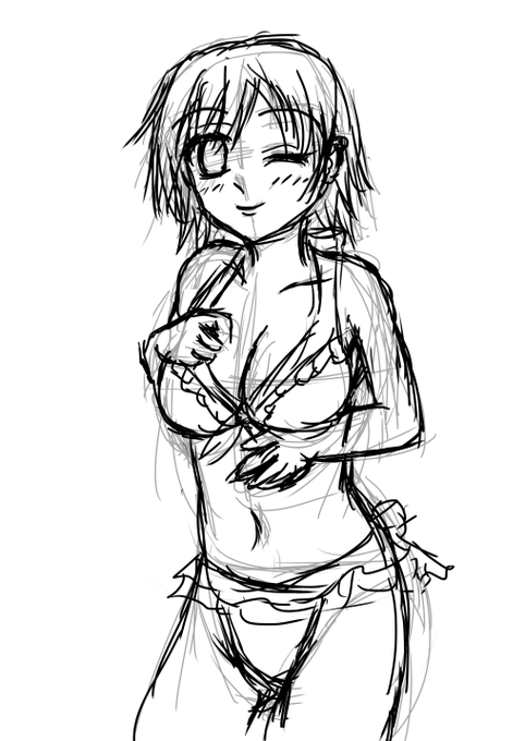 ざっくり水着美央のラフ描いてみたけど 体のバランスおかしくないよね・・・?(指が雑なのは後で直すので仕様です) モバマスの特訓後水着未央見ながら描いているんですが元(本家)→の未央見ると意外と体細いなぁ・・・ #本田未央