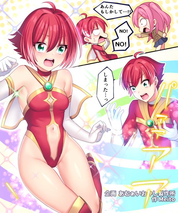 めいと@meito_67さんに、「正体がバレると女の子にされてしまうというペナルティを持ったスーパーヒーローだったが、幼なじみの少女に正体がバレた事でスーパーヒロインになってしまう。」という設定で描いて貰いました!