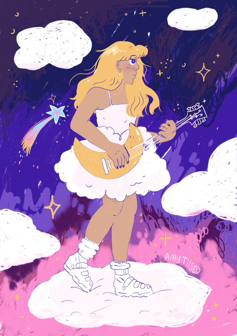 The scan came out way pinker but I do like it a lot! Plus the original painting, me trying to work out colours on Procreate and a glitchy scanned in version ✨