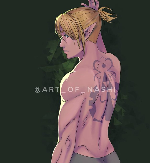 Number 1 of my #sixfanartschallenge - Link!! The first time I saw him with a ponytail I decided that that was his hairstyle forever. Also decided to randomly give him a back tattoo? Why cause it's hot and I wanted to that's why don't @ me...