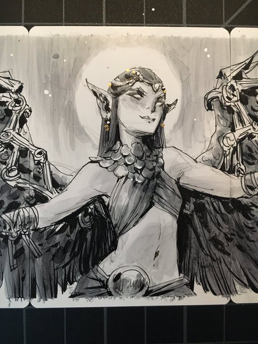 My Angel triptych panorama done for #Magictober is up for auction, both preliminary and final! Ink, marker, and gold paint, check em out 👇