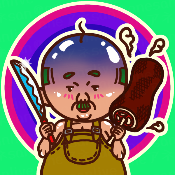 ちょっと前にごひいきさんのイメージイラストを描く雑談配信をして、昨日完成したからご紹介🎨いつも配信に来てくれるジョンさんです🔪💥デベデのトラッパー風、素顔は可愛いおじさんをイメージして描いたよ😊お肉はデベデ名物ケバブです🍖✨