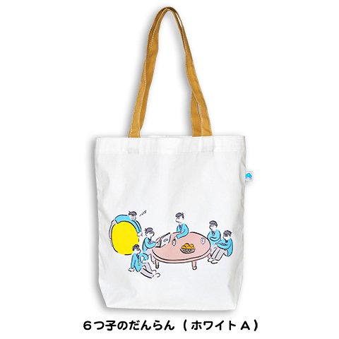 【6つ子のトートバッグ】おなじみの「ちゃぶ台」を囲んだシーンと、ツナギ姿の6つ子たちと80s風な「松マーク」や「おでん」モチーフを散りばめた総柄の2タイプ。https://t.co/eCt2fY4DDr #おそ松さん
