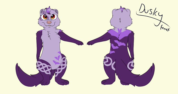 created a ref of a ferret character for a friend who wanted an all purple ferret with bats and celtic knotwork so this is dusky she is deciding on gender at the moment but the name is staying