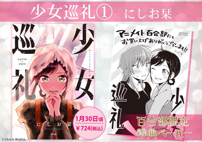 百合部限定特典も各種実施中です!まずはサイコミさんにて好評連載中のにしお栞先生の『少女巡礼 1』!#アニメイト百合部 限定ペーパー付きで大好評発売中です!エクレアでも「クリーンルームの涙」という素敵な三角関係百合を描かれていました!吸い込まれるような表紙が気になったらマストバイ!