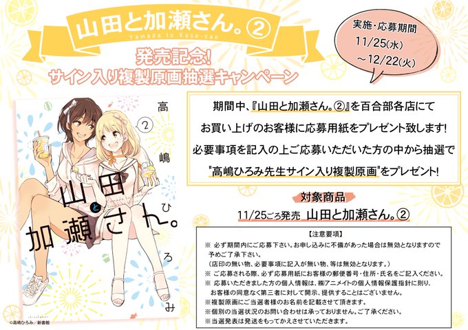 明日、25日頃発売となっております、『山田と加瀬さん。』『みーちゃんとアイリ 上・下』ですが、早いお店だと入荷が始まっている様子、お店によって入荷状況は変わりますので、来店の前に各店twitterを確認するか、電話で入荷状況を確認したりしてみてくださ~い。 #アニメイト百合部