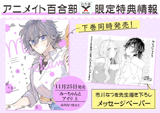 11月25日ごろ発売のウイングスコミックス『#みーちゃんとアイリ 上・下』の発売を記念してフェアを開催!上巻には市川なつを先生描きおろしのペーパーを、下巻にはサイン入り複製原画が抽選で当たるかも?な応募用紙をプレゼント🎁一緒に買ってLet's一気読み!#アニメイト百合部