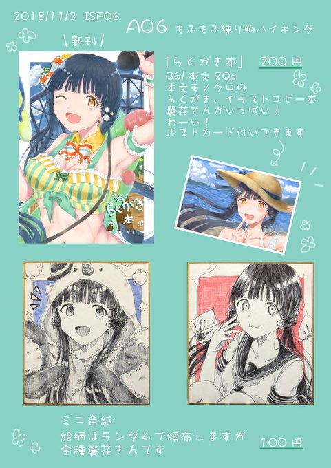 11月3日開催ISF06【A06】もふもふ練り物ハイキングの新刊サンプルとお品書き 麗花さんいっぱいなコピー本B6/本文20p/200円におまけでポストカードが付いてきます!ゲストでりんたろうさんに1枚イラストを描いて頂きました! ミニ色紙は絵柄ランダムの麗花さん、1枚100円 よろしくおねがいします! #ISF06