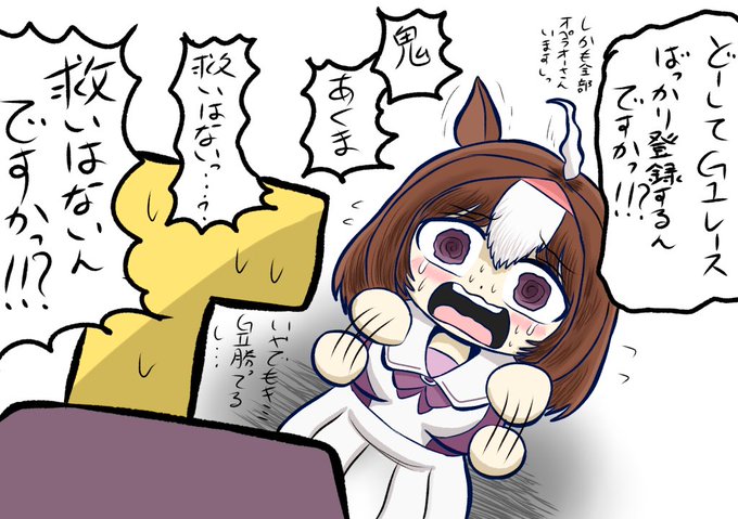 #ドトウちゃんを困らせたい #メイショウドトウ G1レースばかり登録してテイエムオペラオーなどの強い馬としか闘わせない。救いはないんですか!?(過去絵)