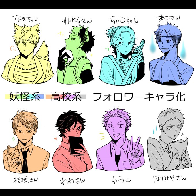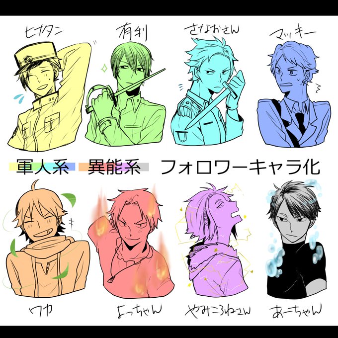 遅くなりましたが出来ました!!ただ描くのじゃ面白くないんで、軍人系、異能系、妖怪系、高校系って分けて描いてみたんで反応してくださった方自分の見つけてみてくだせぇ!