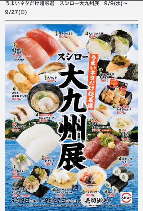 9月9日から9月27日まで〜スシローでうまいネタだけ超厳選のスシロー大九州展♫写真にのせられなかったけど〜一通り注文😄個人的には、あご出汁使用のとんこつラーメンがドロっと豚骨濃厚で病みつきでうめぇ😋本場白くまパフェも最高😋お会計2500円😓#九州うまかもん #九州はよかロー #スシロー大九州展