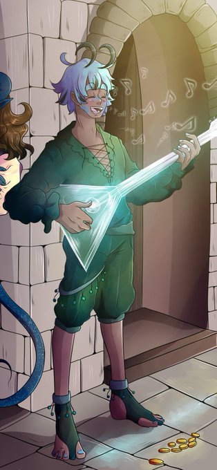 @Kiradraws1 FELICIDADES BONITISIMA!! Pues aqui te dejo a mi hijin Rocco😳 es un changeling bardo (y un poco brujo tambien(?)) Y le gusta tocar su balalaika de cristal😊❤️