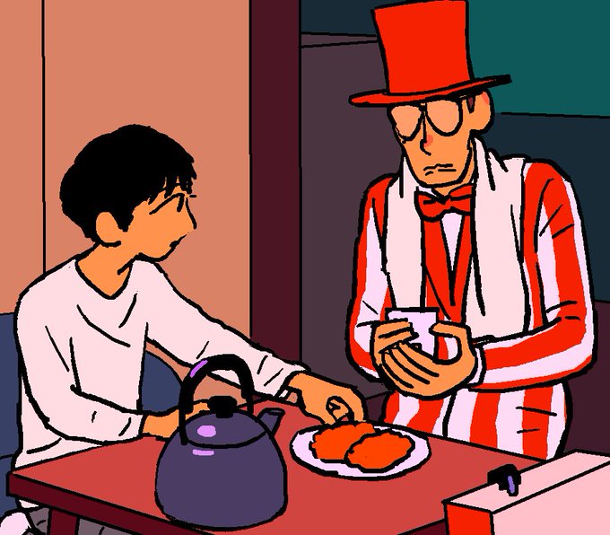 台風コロッケ…じゃなくてこれはメンチカツ。 初めて部屋に上げてもらったときのシーンを改めて描いていた。メンチをもぐもぐするクっさんを見つめる古賀が完全に保護者の目。