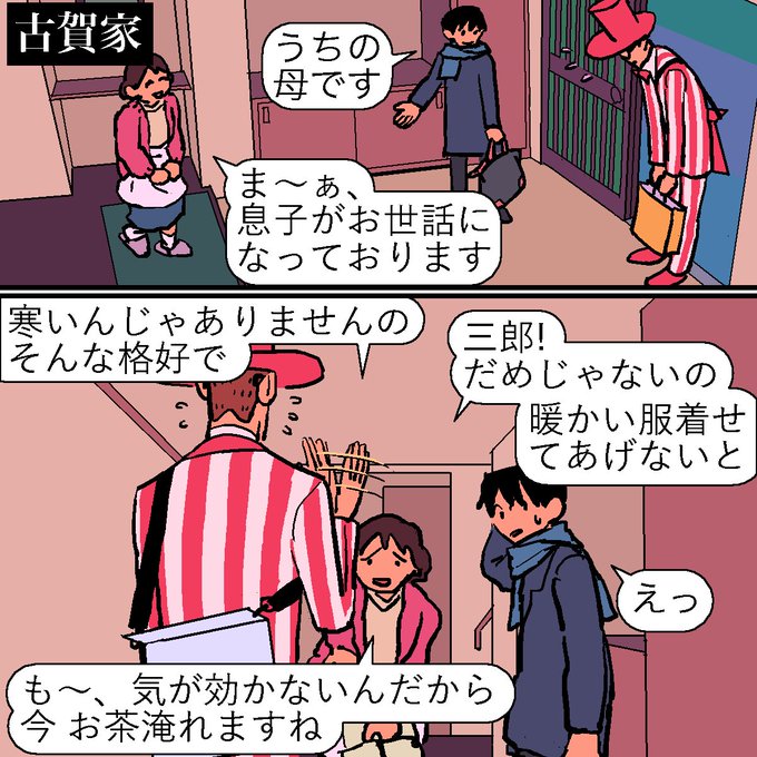 2コマ目、三郎が手に持ってるものは包丁です。