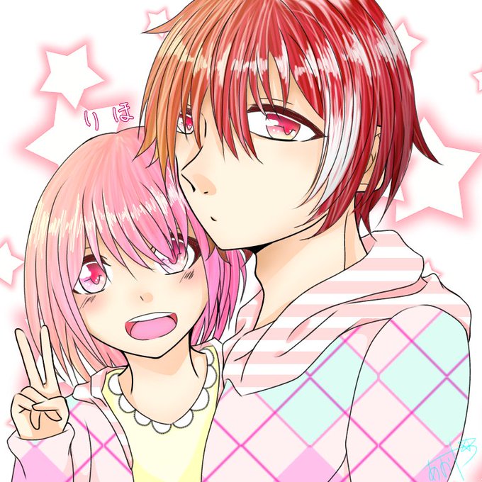 りほ〜固定キャラ描けたよ! 男の方ピンク髪似合わなかったから赤にしました(><) 下手ですいません! @y_ri469