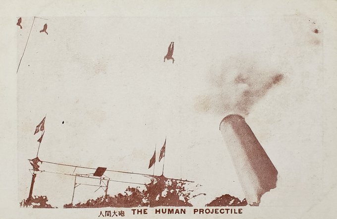 〈特別大余興 人間大砲〉 一枚だけ人間大砲の絵はがきを持っているが、写真を見るにつけ大丈夫だろうかと思ってしまう。昭和5年、神戸の海港博覧会で飛んでいるのはドイツ人ライネルト氏。 https://t.co/fUWKzUdIMC