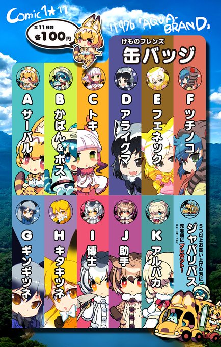 4/30Cimic1け47b「AQUA-BRAND」新刊は、けものフレンズ本です。コピーになってしまい申し訳ございません(><)グッズは缶バッジで、前回から5種増えまして、全11種類になりました!5個以上お買い上げの方に先着順でジャパリバスの缶バッジをプレゼント致します(^^)