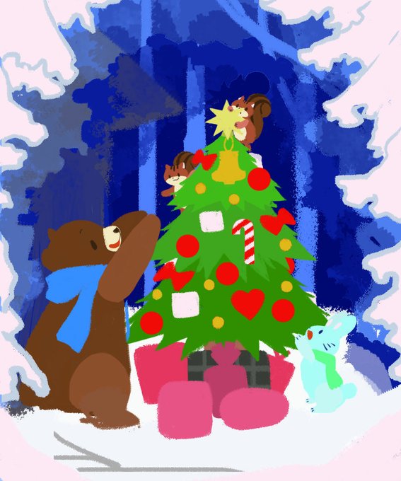 「クリスマスを飾ろう!」 描けたー!✨ツリーを飾り付けてわくわくクリスマスの始まりだね♪ メリークリスマスを素敵なみんなと一緒に🎄😊 #クリスマス #クマ #リス #ウサギ #フクロウ #クリスマスツリー #Christmas #art