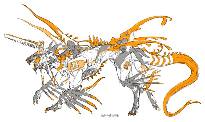 近接特化型対装甲兵器 運用前試験での戦闘で相手となった機械兵器の冷却油タンクを一撃で穿ち刳り、噴出したオイルを硬質化させて身に纏っている オイルのオレンジ色と試験時刻から暮れの名を与えられた #二つ名モンスター化 #鋭剣の暮れ刳れ
