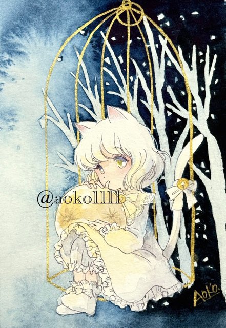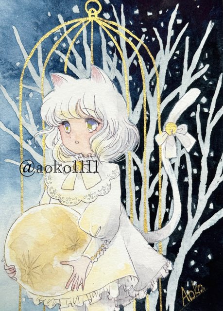 #月と猫は夜に語らう 金の籠に入った白猫ちゃんです。 原画はキラッキラ✨です。 本日20:30〜通販2次抽選の申込が開始されますので見てしていただけたら嬉しいです☺️