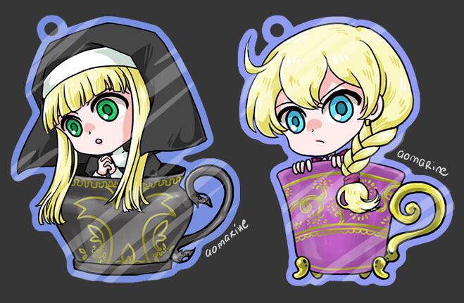 Zektbach tea cup charms- Malchut, Gijiri, L'erisia, Hannes & Nox. Everyone looks kinda happy except Gijiri & Nox lol