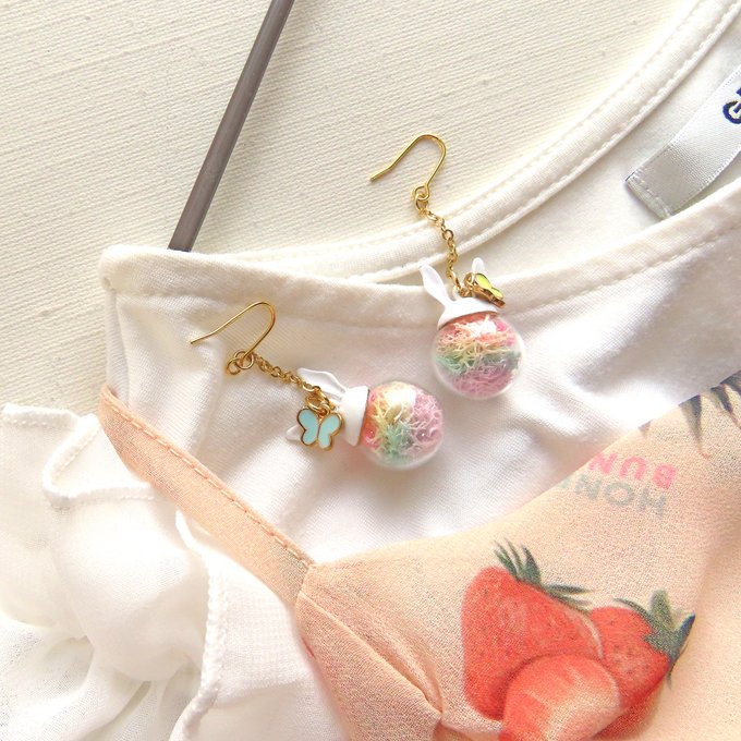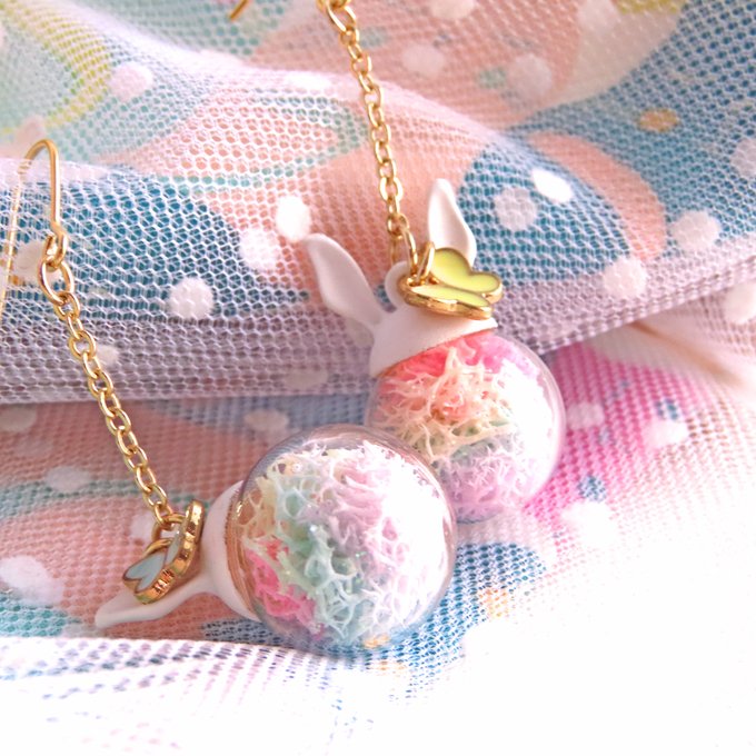 パステルカラーのミニ蝶々とゆめかわいい白うさぎ【ラメ入り】ガラスドームピアス/ガラスドームイヤリング