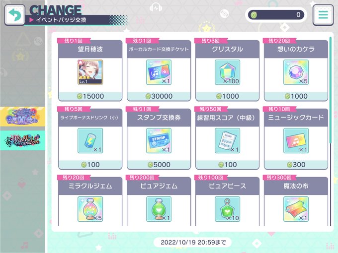 また今回から、イベントバッジ交換所のラインナップも更新されました。想いのカケラはよく利用するので、なるべく交換しましょう。