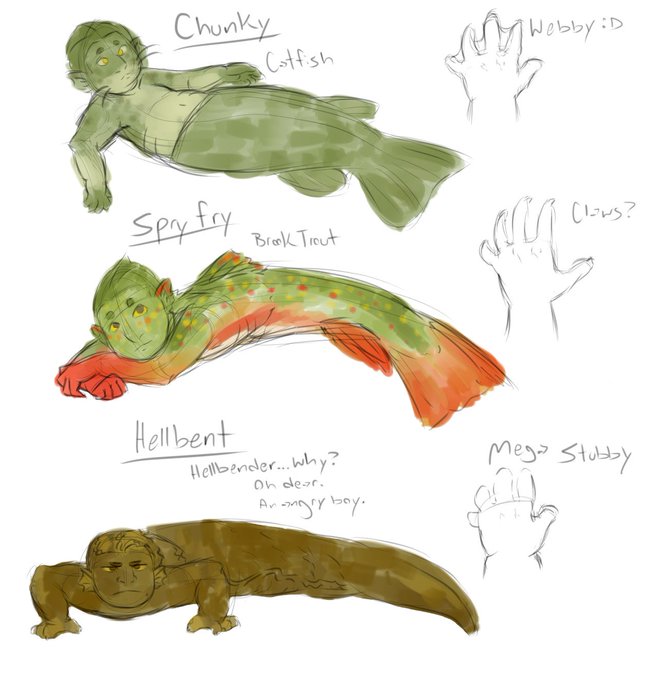 a #mermay warm up scribble... I designed little mer-catfish on the right over five years ago, and I was utterly delighted when I first saw Fjord from #CriticalRole