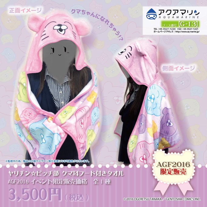 【ヤリチン☆ビッチ部】「クマ耳フード付きタオル」の量産サンプルが届きました!クマちゃんがいっぱいプリントされております!生地もとてもふわふわできもちいい…♪各アイテム、AGFに向けて鋭意制作中です!お楽しみに! #AGF2016