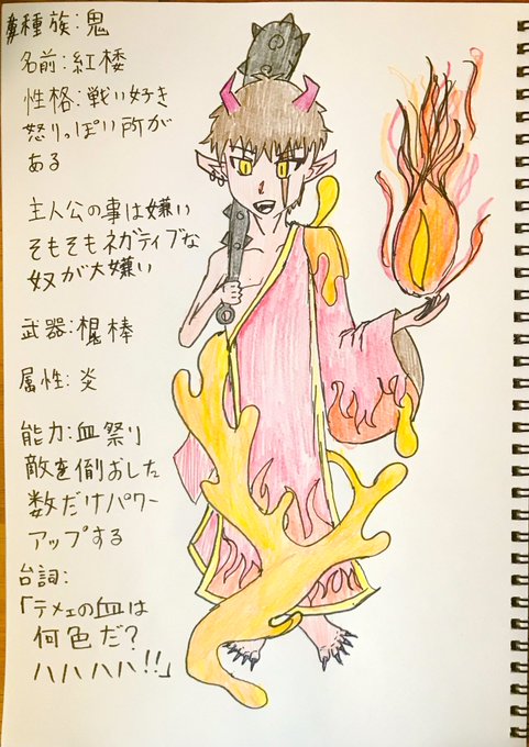 とりあえず2人の鬼 1枚目、刺客1紅楼(こうろう) 2枚目、刺客2蒼星(そうせい) あと2人鬼描きます