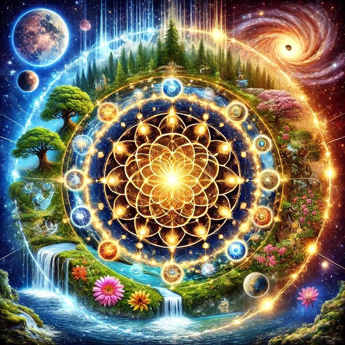 龍体文字は同じく神代文字と呼ばれるが古代宇宙観を現したものや占いに使用されたとされるフトマニ図になってるのも多い。これをAIが絵画的に解釈するとこのようになったが面白いのはフトマニ図は円だけでなく周縁の星や自然にまで拡張されて現れていること。美しい宇宙観そのものように感じた。