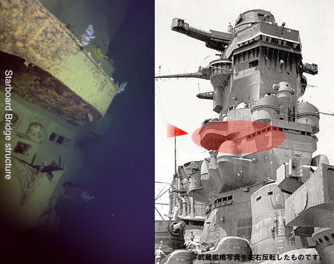 Paul氏によって新たに公開された戦艦武蔵の動画により艦橋部の状態が発表。詳細部分と該当箇所の比較写真まとめ。大和同様に船体部から爆発分離して海底に横倒しになっている模様。