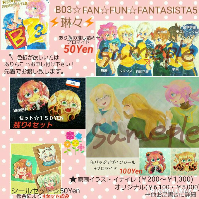FFFのお品書きです! 4つだけ以外のものも沢山用意してないのと、絶対机足りないので出さない原画もあると思います😅在庫確認・お取り置き等あればお気軽にどうぞ✨✨ ➡https://t.co/KMy1I0tHwe (赤ブダラーと次のツイ)
