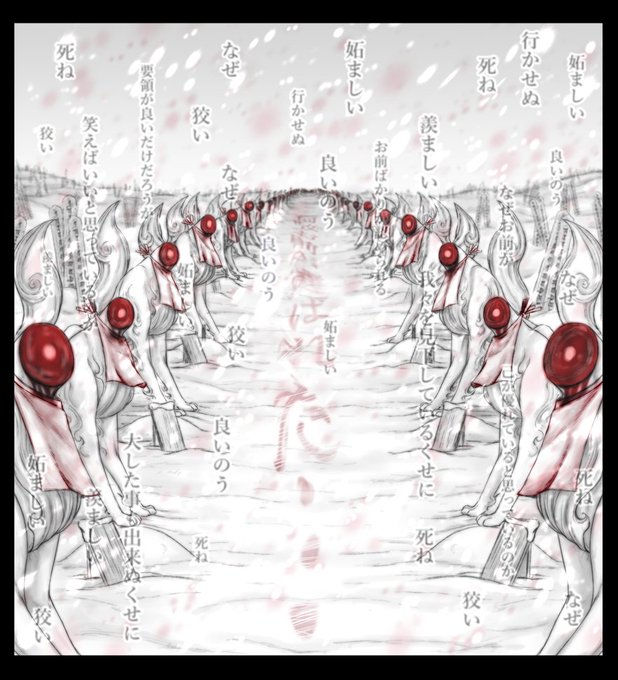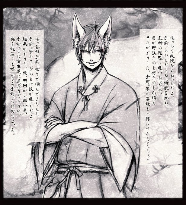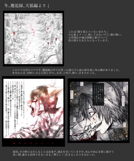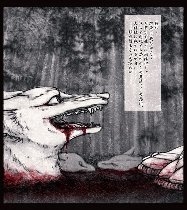 そういやの書き忘れ小ネタ。 しっぽの数、最初のコマ三本→最後のコマ四本 この仲間殺しは最後の試練。 神の理で地に生きる者を禊ぐ際、理不尽を被る事もあると心せよ。 神の理は地に生きる者の理に非ず。 というやつです。