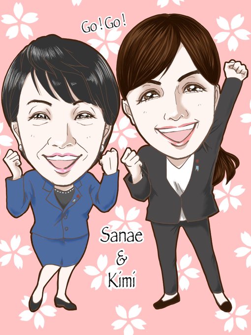 大和花さんにリクエストのツーショット、桃の季節に誕生の高市早苗さんと桃の国の正義の味方小野田紀美さんのイラストです☺️