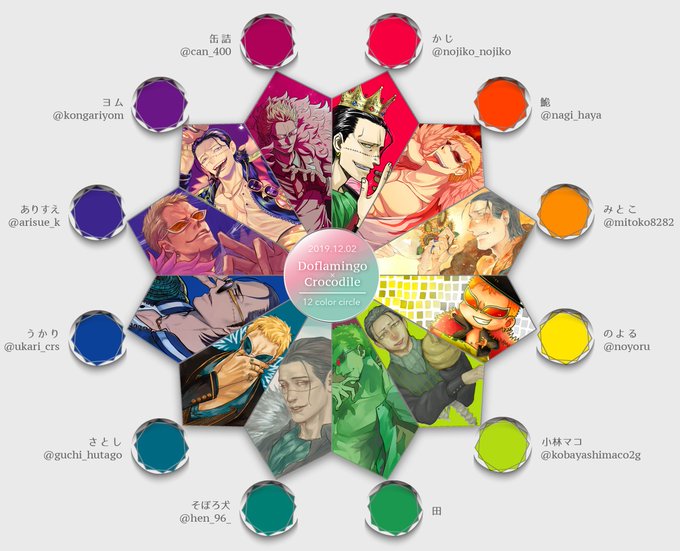 ドフ鰐の日おめでとうございます!!🎉🎉記念にドフ鰐12色相環を!めちゃくちゃステキなカラーサークルが完成しました!✨ご参加くださった皆様、本当にありがとうございました!!😭🙏 #みんなのイラストで12色相環 #12月02日はドフ鰐の日