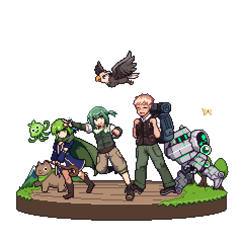 作者の月川さま(@tsuki_kawa)にSKIMAで依頼させていただきました!冒険するめざエネとそれぞれの相棒のドットイラストです!